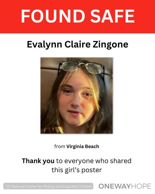 Evalynn Claire Zingone, who was reported missing from Virginia Beach, has been safely found.