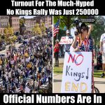 Official Numbers Are In: Turnout For The Much-Hyped No Kings Rally Was Just 250000 October 22, 2025 by Alex Bruno Categories: Satire The official numbers are in, and the much-hyped “No Kings Rally” has finally met its royal reckoning: a modest 250,000 people — or, as organizers previously described it, “millions upon millions.” After a week of breathless […]
