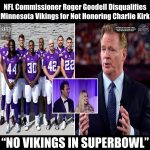 NFL Commissioner Roger Goodell Disqualifies Minnesota Vikings for Not Honoring Charlie Kirk: “No Place for You on the Field” September 29, 2025 by Alex Bruno Categories: Satire In what may be the most explosive decision in professional football history, NFL Commissioner Roger Goodell has officially disqualified the Minnesota Vikings from the 2025 season, citing their refusal to hold […]